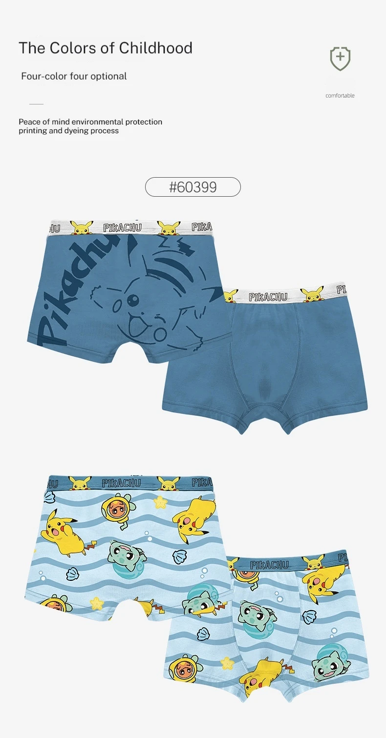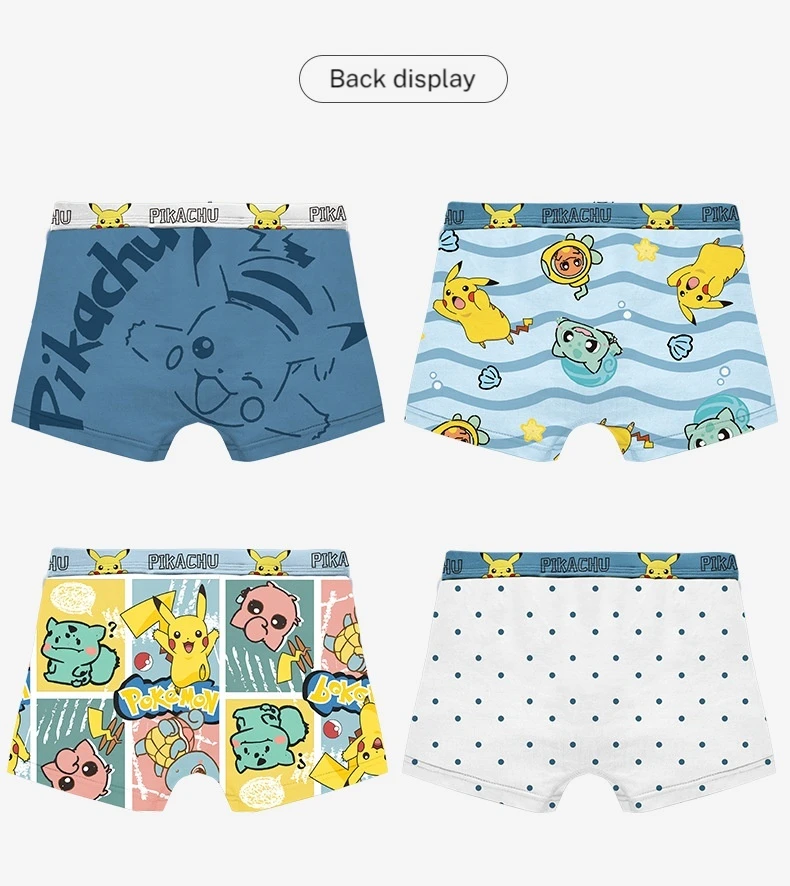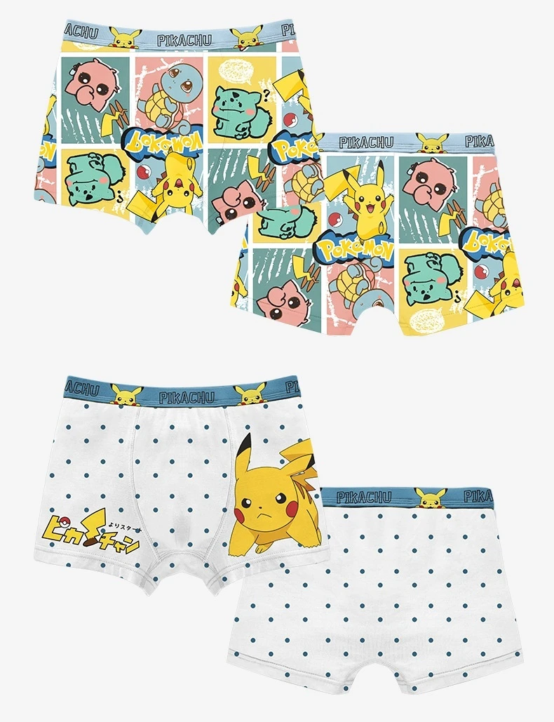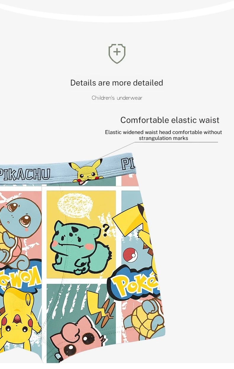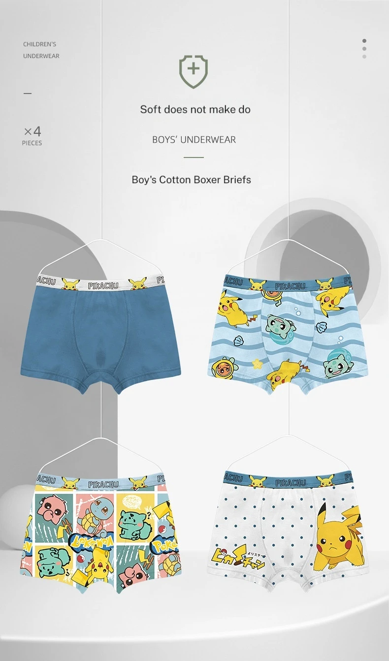 4-piece Pokémon boys’ cotton underwear set featuring Pikachu and friends. Made from soft, breathable cotton with elastic waistband for comfort and durability. Perfect for daily wear in spring and summer.