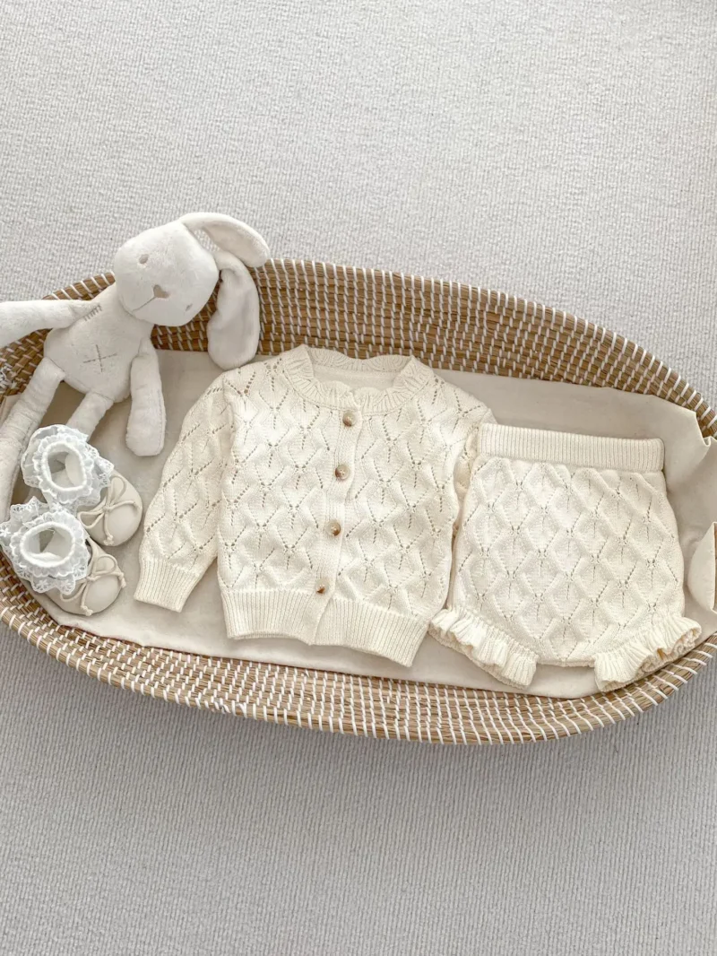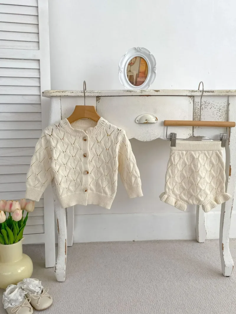 Introduce timeless charm to your little one’s wardrobe with this Baby Girl Knitted Clothing Set. Designed with care, this two-piece outfit includes a delicate knitted cardigan and matching knitted shorts, making it perfect for spring and autumn wear. Crafted from soft breathable cotton, this baby girl knitted clothing set is gentle on sensitive skin while offering all-day comfort.