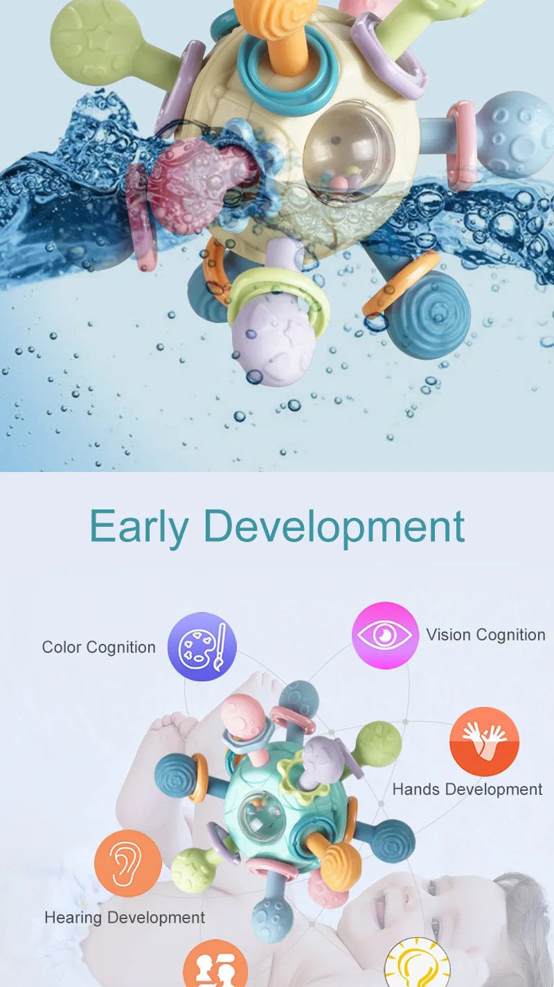 Every section of the ball features pastel tones and diverse textures—smooth, coarse, and ribbed—to improve visual cognition and tactile awareness. Babies can rotate, stretch, and chew safely on the silicone nodes.