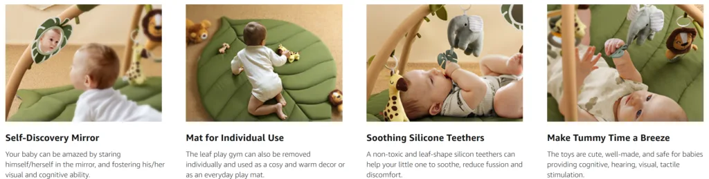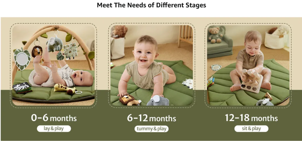 I am absolutely in love with this play gym! The oversized leaf design is so unique, and my baby loves the variety of detachable toys. It’s big enough for tummy time and super easy to clean. Plus, the material is soft and safe for my baby’s sensitive skin. Highly recommend for anyone looking for a versatile activity mat!