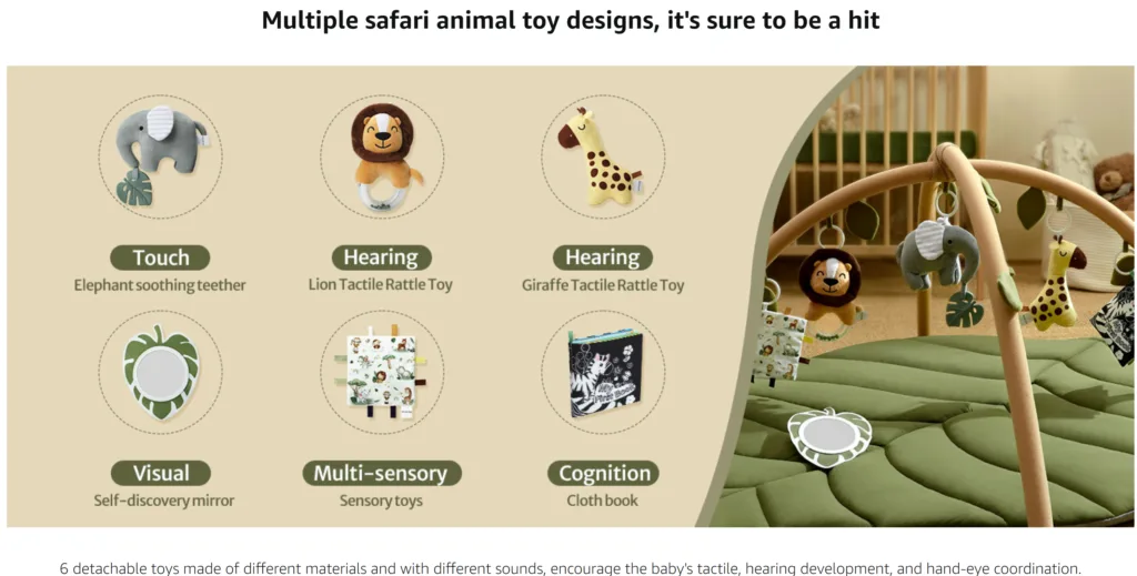 - Early All-around Development – 6 detachable animal motif accessories include lion rattles and giraffe rattles for sense of hearing, elephant teether for bite training, cognitive mirror for self-awareness, sensory toys and cloth book for visual and tactile training. Allows baby to promote hand-eye coordination, visual, auditory, tactile and motor skills during enjoyable playtime, fully promoting sensory development.
