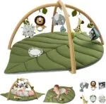 - Extra Large & Super Comfortable – 53 x 37 x1 inches baby activity mat provides a larger and safer play space for baby to roll over and sit up. It’s made from high quality fabrics with thick texture, safe and comfortable for baby’s skin. And the back is non-slip to prevent sliding on the floor. The leaf play gym can also be removed individually and used as a super-cute backdrop for monthly photos or as an everyday play mat.