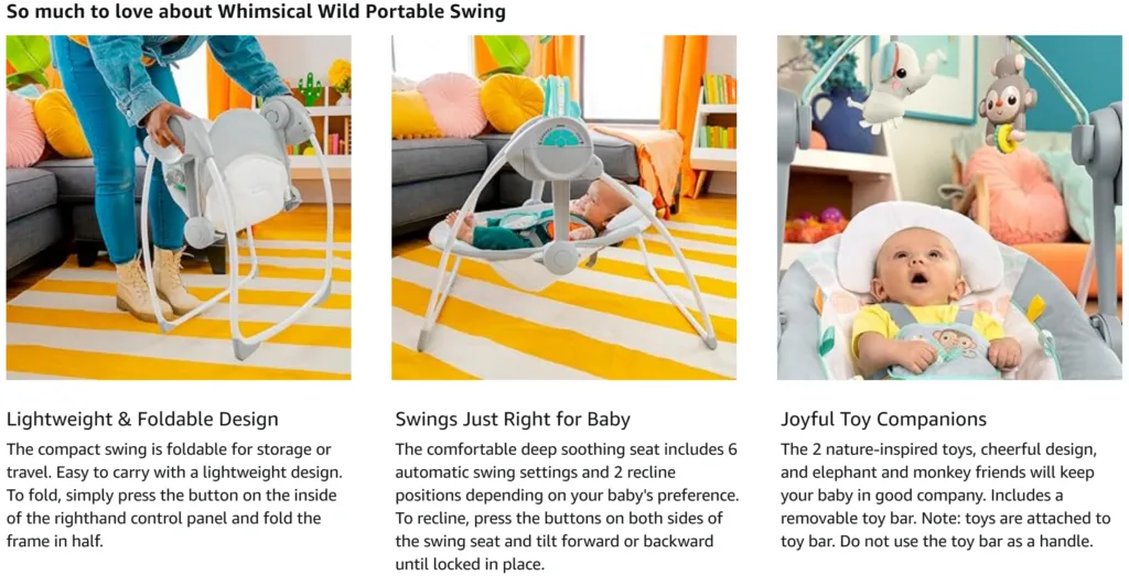 Compact and reasonable for the price, easy to assemble, I like the height and weight. The activity bar is useless and flimsy… it’s a foot above baby and hangs over their head, so either they a) can’t reach it and can’t really even look at it or b) you can add a few extra clips to lower the toys but they’re still swinging at whatever rate the swing is swinging so it’s hard for a baby to manipulate. As many others have pointed out, I found the recline positions to be less than ideal for an infant, which is when most people are going to want a swing.