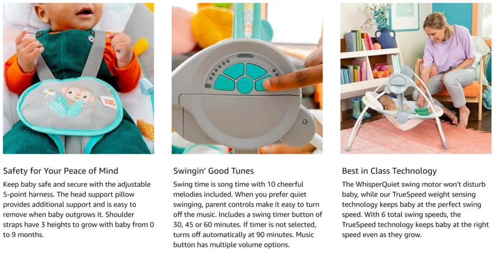 6 speeds with WhisperQuiet technology that won’t disturb baby; TrueSpeed weight sensing technology keeps baby at the perfect swing speed; maintains different speeds as baby grows