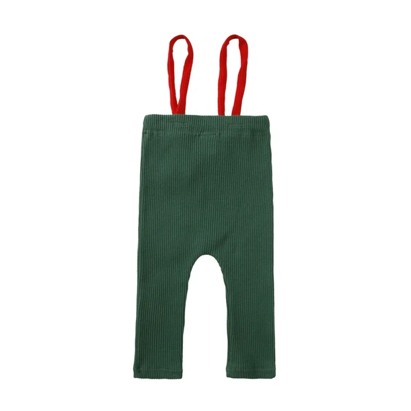 The festive red straps contrast beautifully with the rich green overalls, creating a joyful Christmas vibe. A matching Santa hat with a fluffy pom-pom completes the look, making it ideal for holiday pictures and celebrations.