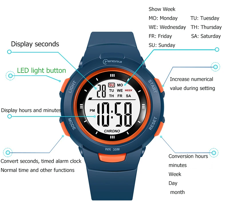- Features: Luminous, Waterproof, Alarm, Digital display