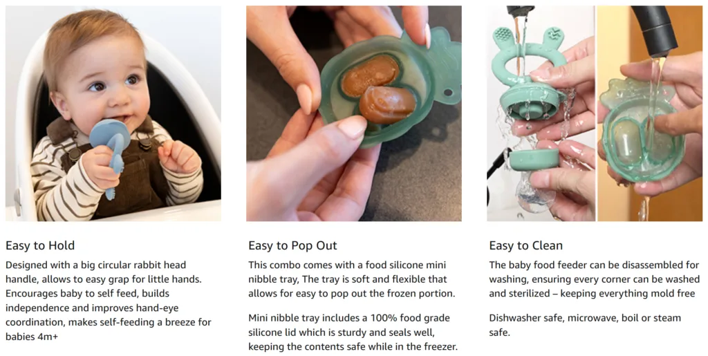 This feeder and freezer tray combo makes self feeding easier and cleaner. The silicone is soft, safe, and easy to hold, even for small hands. The freezer tray is helpful because I can make breastmilk popsicles ahead of time and pop them into the feeder when my baby needs quick relief. It keeps my baby calm during teething and cuts down on the mess I used to deal with. If you want a safe way to let your baby explore new flavors and soothe sore gums, this set works well.