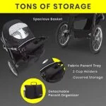 - Durable steel frame with high quality tech fabric; Includes detachable parent organizer; Convenient fabric parent tray with 2 cup holders & covered storage compartment to keep essentials close; Meets Disney size requirements