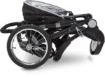 - Swing away child tray for easy infant loading Generous undercarriage storage bin Large 16″ back metal air spoke wheels with ball bearings; Front 12″ swivel metal air spoke wheel with swivel lock