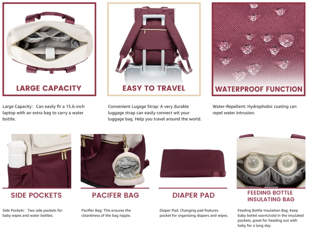 When searching for a diaper bag, I look for the right size , that it’s easy to clean, easy to carry , great quality , it’s organized and has functionality, this bag has all that and more! What drew me in was the stylish design! It’s so beautiful! I get compliments on it daily. The amount of pockets it has is incredible and very convenient especially on the go. I have space for baby items , folders and papers, it has a little separate bag on the outside for a pacifier that i love. I look for lots of things in a diaper bag, especially the ability to double as a purse for my things as well as baby’s items. This item does it! It’s very versatile and can be carried as a backpack when you need it hands free or carried by its straps by hand. This bag checks all the boxes for me when it comes to a diaper bag. I have absolutely nothing but great things to say about it. U especially love the gold trim on it , the gold zippers add a nice touch and adds to the aesthetic. Adjusting the straps make it less heavy when it is packed with all your items . This price was great as well! Gotta say it was worth every penny! Don’t walk, run to purchase this great deal!