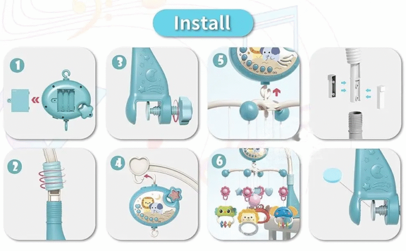 Five detachable rattles shaped like adorable animals rotate slowly to attract your baby’s attention. Each rattle can also be used as a handheld toy, improving visual tracking, grasping ability, and early sensory recognition.