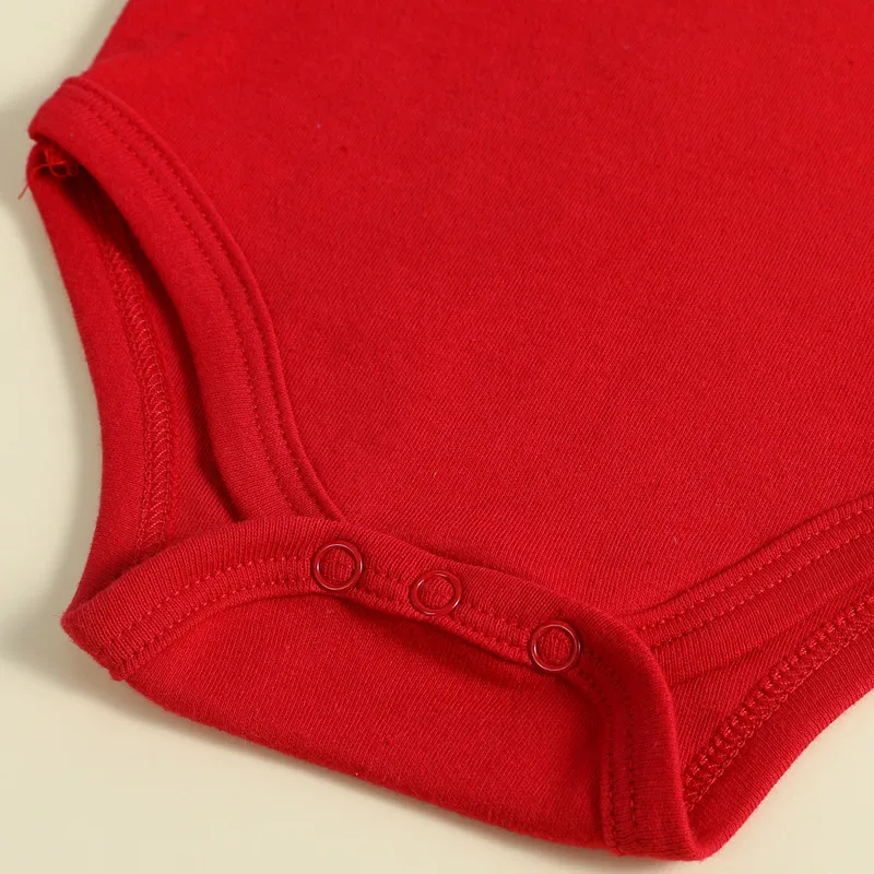 The design includes easy-snap closures at the bottom to simplify diaper changes. Stretchy fabric allows unrestricted movement, while the red holiday shade enhances the cheerful seasonal theme. This My First Christmas baby romper is ideal for baby boys and girls and ensures all-day comfort whether worn alone or layered.