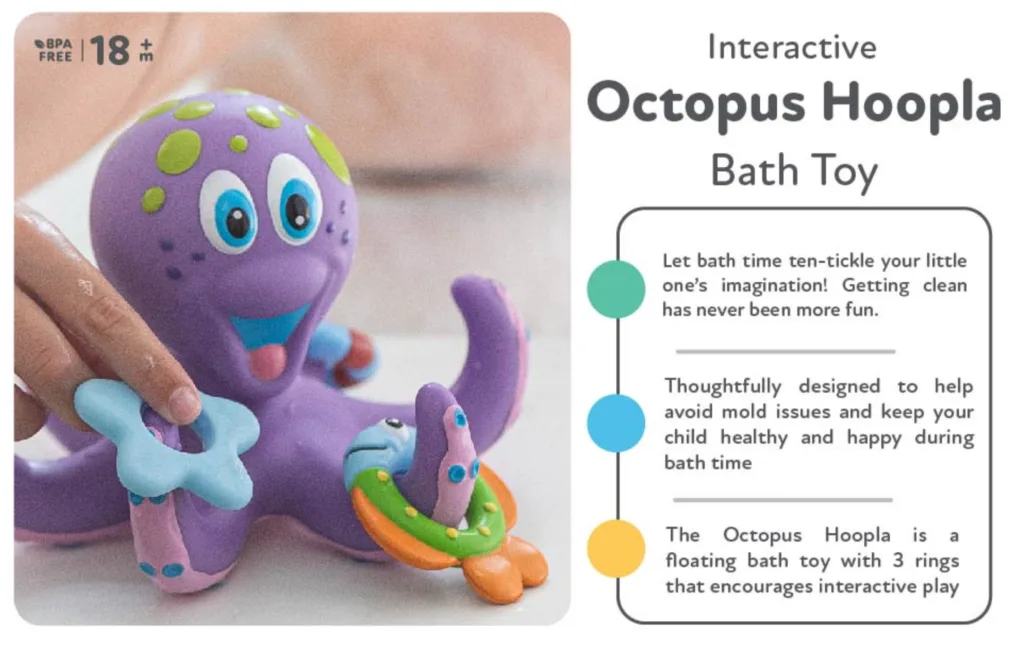Make bath time an opportunity to grow and learn with Nuby’s Floating Purple Octopus Bath Toy. Designed to engage your child’s senses and challenge their motor skills, this cheerful octopus is on a mission for fun. Nuby’s Octopus Hoopla toy floats in the bath water and includes three rings to toss and stack onto the Octopus’ arms. This interactive element is intended to help develop hand-eye coordination. The fun colors and shapes stimulate your child’s senses to make bath time exciting and enjoyable while the toy’s different textures offer a tactile experience making it an easy bathing toy for little hands to grip. Getting clean has never been more fun with the Nuby Octopus Hoopla! Made of BPA-free materials, Nuby baby bath toys are a safe and fun choice to teach your child fun.