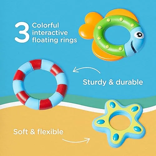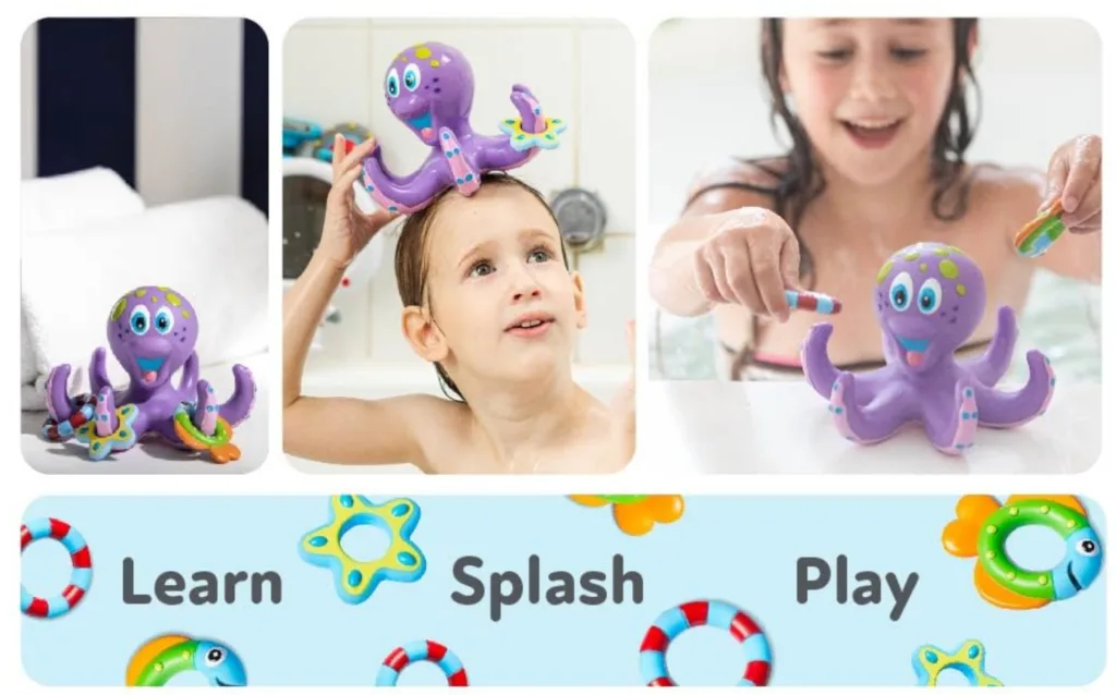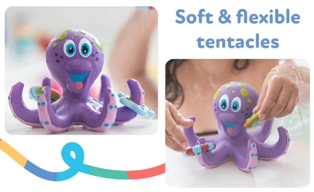 INTERACTIVE BATH TOY FOR KIDS 18+ MONTHS: This baby bathtub toy features a floating octopus and three rings to toss and stack that encourage learning through play and help children learn cause and effect
