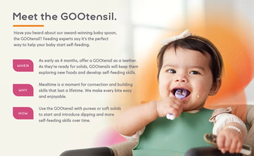 Perfect Starting Solids Utensils & Suction Bowl Duo: GOOtensils work well with purees, soft foods, and solids, and were designed to make starting solids easy and non-slip suction bowls to minimize mealtime mess and stress